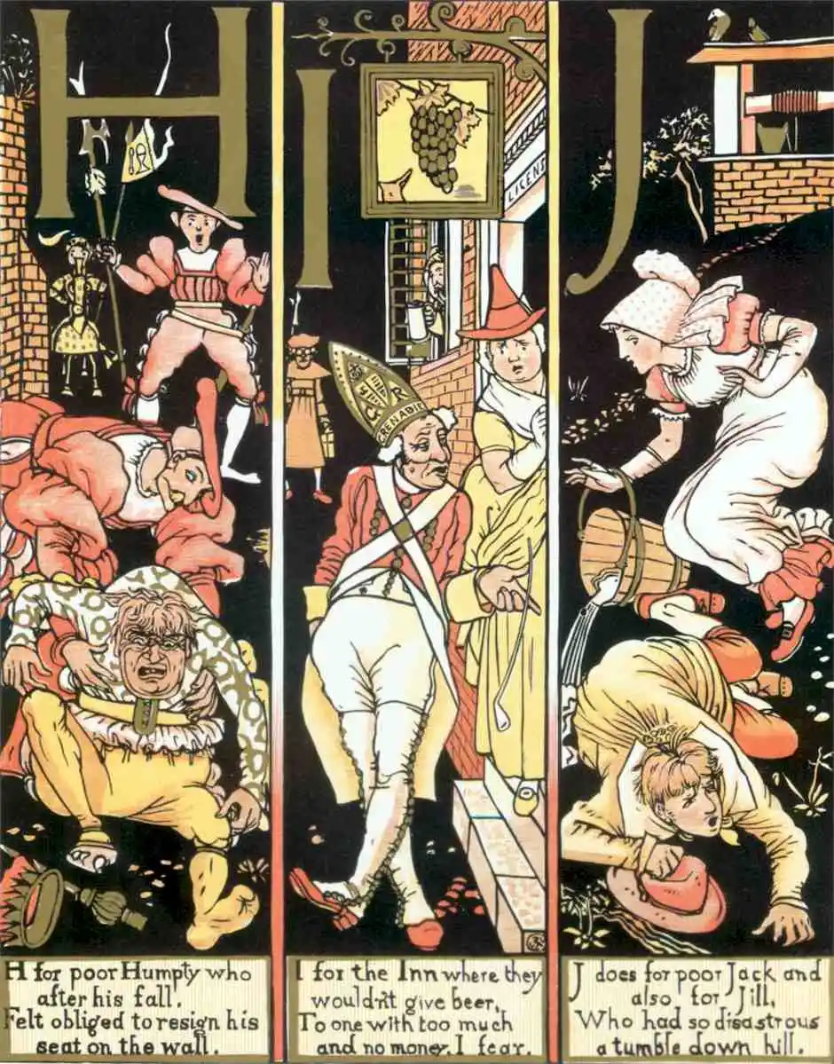 H for poor Humpty who after his fall, Felt obliged to resign his seat on the wall. |