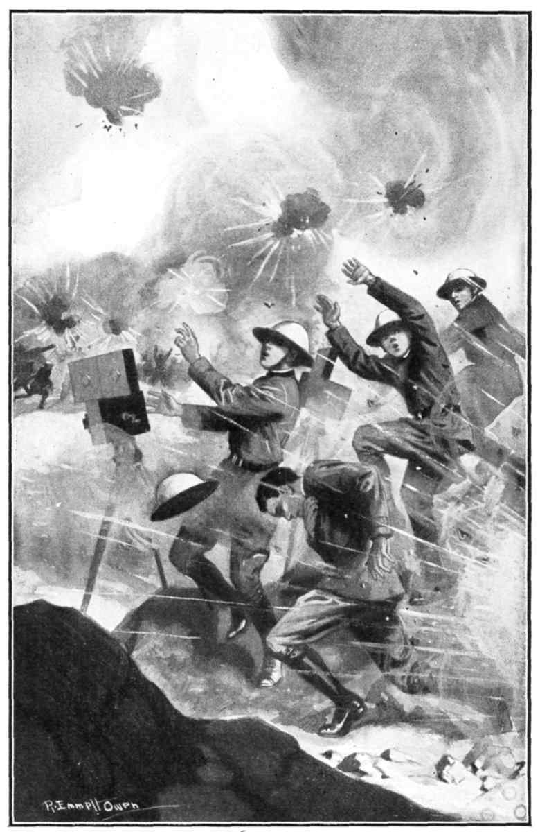 A little later the mimic battle scene was in full swing. Hundreds of blank cartridges were fired, smoke bombs filled the air with their dense vapor, and in the distance bursting shells tore up the earth, far enough removed from the positions of the men to preclude any danger.