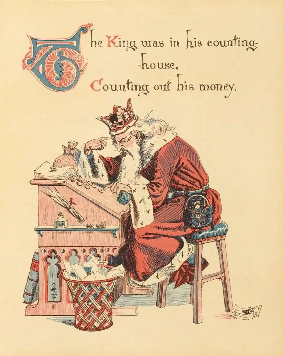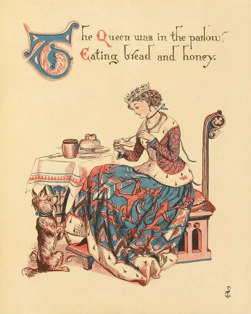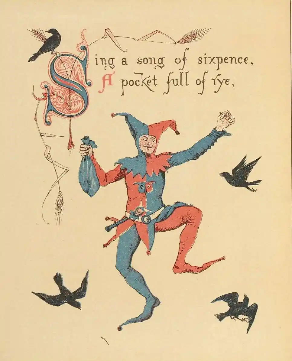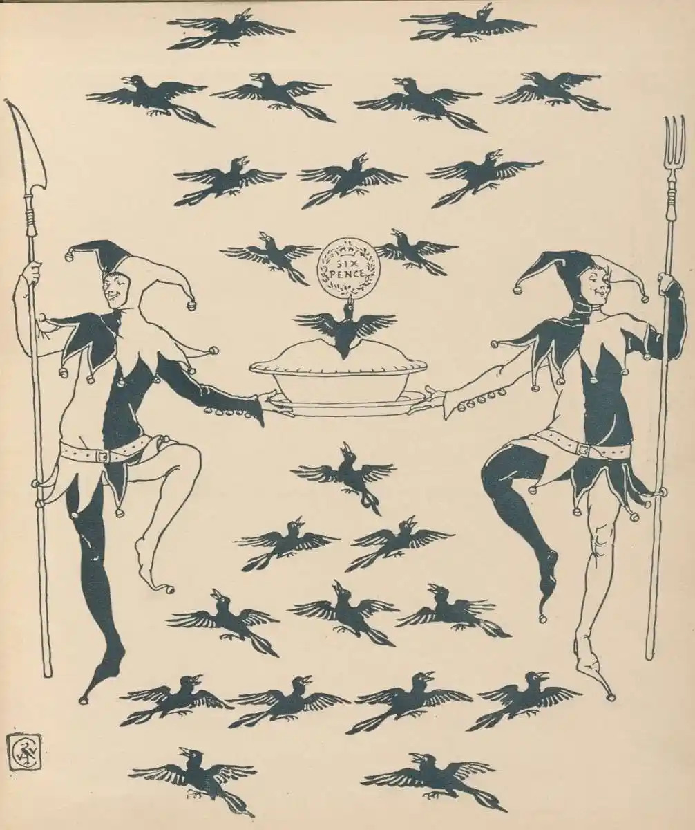 Whether the Poet undertook to write and SING A SONG OF SIXPENCE for that popular price is not stated in his simple rhyme, but, at all events, we learn that he started with "a pocket full," and proceeded to draw on his imagination for all it was worth. What that famous blackbird-pie really cost—except in black-birds—is not disclosed, though the King seemed to show some anxiety about the state of his treasury, as he was discovered "in his counting house" imediately after the feast. But while the Queen, regardless of expense, regales herself on "bread and honey" in "the parlour", and her Maid-of-honour, or perhaps of-all-work, is engaged at the clothes-line, nothing is said about a princess.