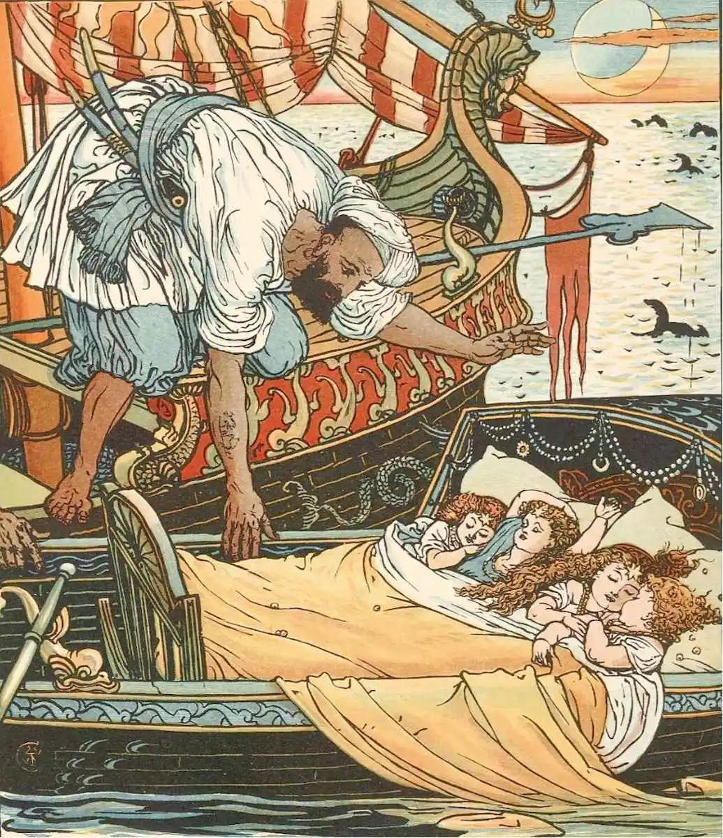 So she had a boat brought round to the beach, and put the four babes, with some strings of jewels, into a cradle, which she placed in the boat, and then set it adrift. The boat was soon far out at sea. The waves rose, the rain poured in torrents, and the thunder roared. Feintise could not doubt that the boat would be swamped, and felt relieved by the thought that the poor little innocents would perish, for she would otherwise always be haunted by the fear that something would occur to betray the share she had had in their preservation.