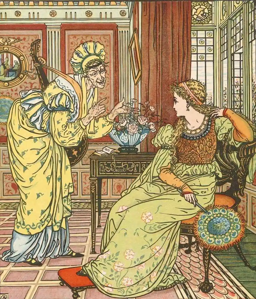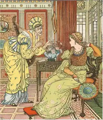 Once upon a time there were three Princesses, named Roussette, Brunette, and Blondine, who lived in retirement with their mother, a Princess who had lost all her former grandeur. One day an old woman called and asked for a dinner, as this Princess was an excellent cook. After the meal was over, the old woman, who was a fairy, promised that their kindness should be rewarded, and immediately disappeared.