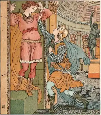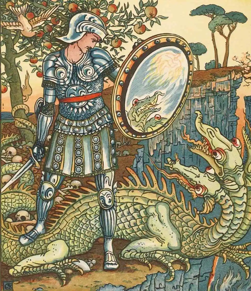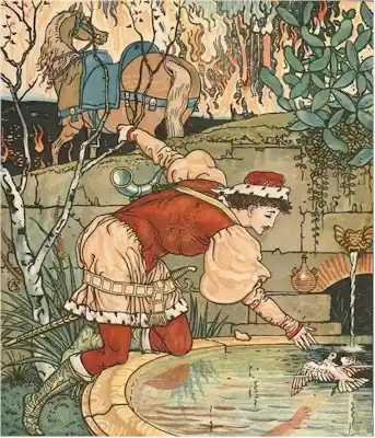 Prince Cheri at break of day perceived a handsome young man, from whom he learned where the singing-apple was to be found: but after travelling some time without seeing any sign of it, he saw a poor turtle-dove fall at his feet almost dead. He took pity on it, and restored it, when it said, "Good-day, handsome Cheri, you are destined to save my life, and I to do you signal service. You are come to seek for the singing-apple: it is guarded by a terrible dragon." The Dove then led him to a place where he found a suit of armour, all of glass: and by her advice he put it on, and boldly went to meet the dragon. The two-headed monster came bounding along, fire issuing from his throat; but when he saw his alarming figure multiplied in the Prince's mirrors he was frightened in his turn. He stopped, and looking fiercely at the Prince, apparently laden with dragons, he took flight and threw himself into a deep chasm. The Prince then found the tree, which was surrounded with human bones, and breaking off an apple, prepared to return to the Princess. She had never slept during his absence, and ran to meet him eagerly.