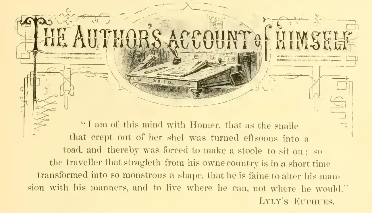 I am of this mind with Homer, that as the snaile that crept out of her shel was turned eftsoones into a toad, and thereby was forced to make a stoole to sit on; so the traveller that stragleth from his owne country is in a short time transformed into so monstrous a shape, that he is faine to alter his mansion with his manners, and to live where he can, not where he would.—LYLY’S EUPHUES.