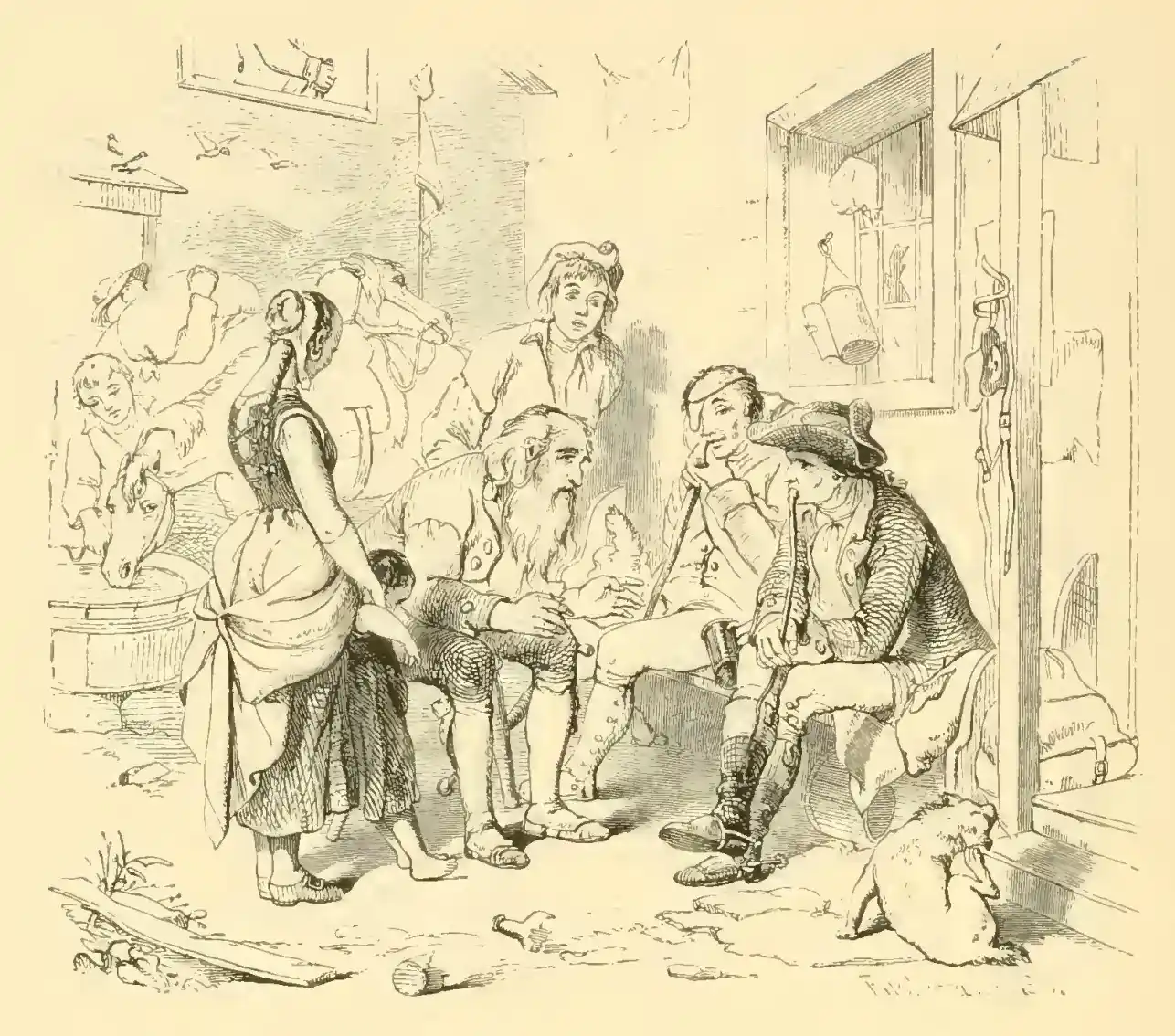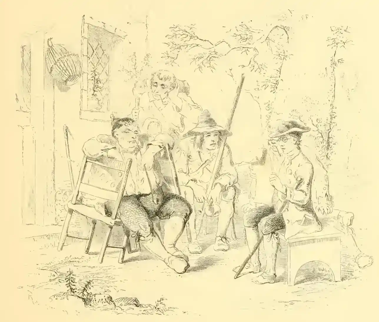 I found him seated on a bench before the door, smoking his pipe in the soft evening sunshine. His cat was purring soberly on the threshold, and his parrot describing some strange evolutions in an iron ring that swung in the centre of his cage. He had been angling all day, and gave me a history of his sport with as much minuteness as a general would talk over a campaign, being particularly animated in relating the manner in which he had taken a large trout, which had completely tasked all his skill and wariness, and which he had sent as a trophy to mine hostess of the inn.