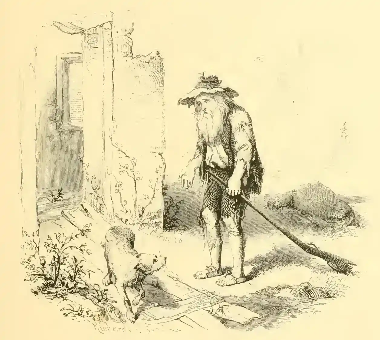 His family consisted of a large black cat with one eye, and a parrot which he had caught and tamed and educated himself in the course of one of his voyages, and which uttered a variety of sea-phrases with the hoarse brattling tone of a veteran boatswain. The establishment reminded me of that of the renowned Robinson Crusoe; it was kept in neat order, everything being “stowed away” with the regularity of a ship of war; and he informed me that he “scoured the deck every morning and swept it between meals.”
