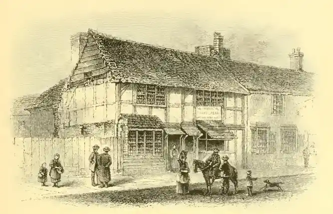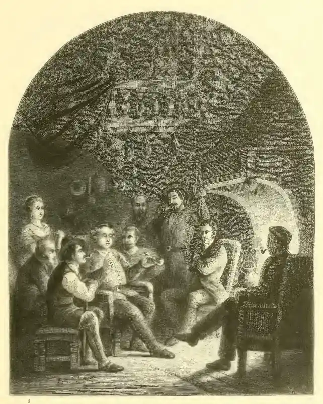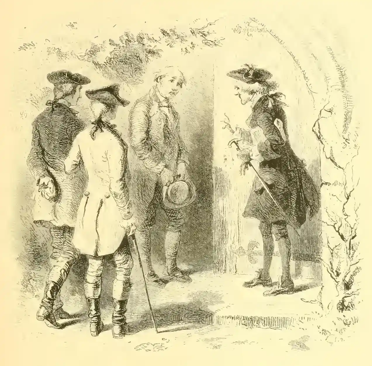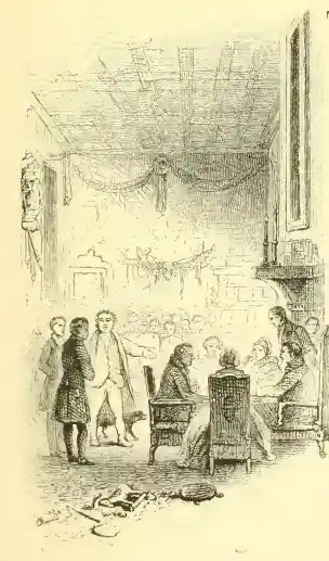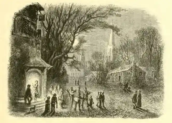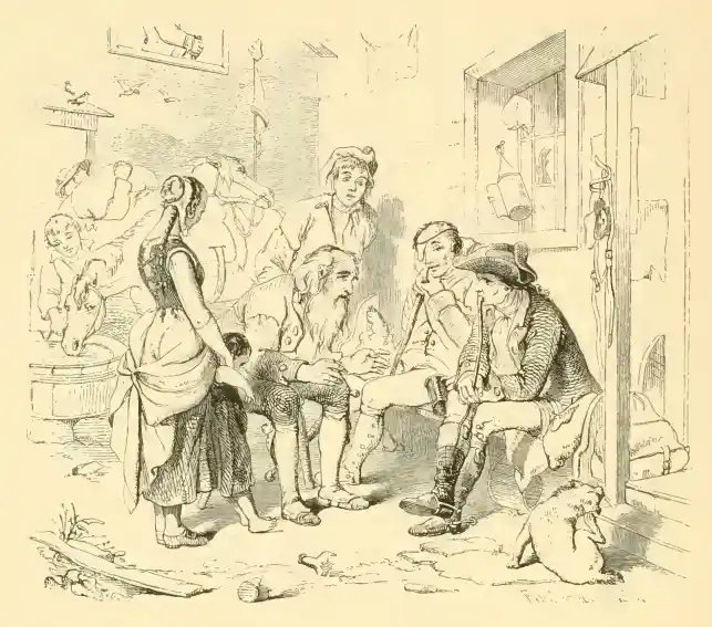 It was toward evening that Ichabod arrived at the castle of the Heer Van Tassel, which he found thronged with the pride and flower of the adjacent country—old farmers, a spare leathern-faced race, in homespun coats and breeches, blue stockings, huge shoes, and magnificent pewter buckles; their brisk withered little dames, in close crimped caps, long-waisted shortgowns, homespun petticoats, with scissors and pincushions and gay calico pockets hanging on the outside; buxom lasses, almost as antiquated as their mothers, excepting where a straw hat, a fine ribbon, or perhaps a white frock, gave symptoms of city innovation; the sons, in short square-skirted coats with rows of stupendous brass buttons, and their hair generally queued in the fashion of the times, especially if they could procure an eel-skin for the purpose, it being esteemed throughout the country as a potent nourisher and strengthener of the hair.