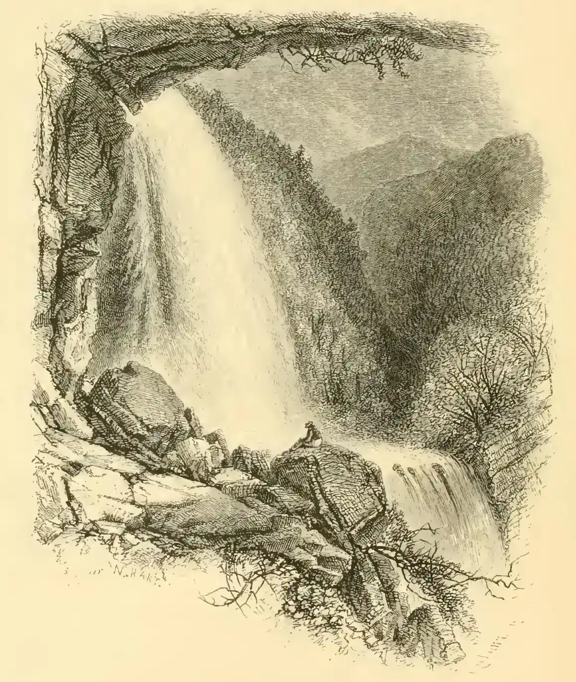 Further reading and thinking, though they brought this vague inclination into more reasonable bounds, only served to make it more decided. I visited various parts of my own country; and had I been merely a lover of fine scenery, I should have felt little desire to seek elsewhere its gratification, for on no country had the charms of nature been more prodigally lavished. Her mighty lakes, her oceans of liquid silver; her mountains, with their bright aerial tints; her valleys, teeming with wild fertility; her tremendous cataracts, thundering in their solitudes; her boundless plains, waving with spontaneous verdure; her broad, deep rivers, rolling in solemn silence to the ocean; her trackless forests, where vegetation puts forth all its magnificence; her skies, kindling with the magic of summer clouds and glorious sunshine;—no, never need an American look beyond his own country for the sublime and beautiful of natural scenery.