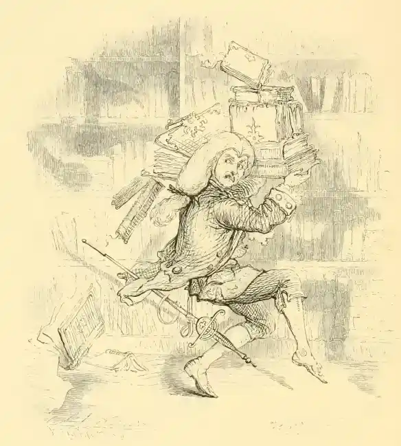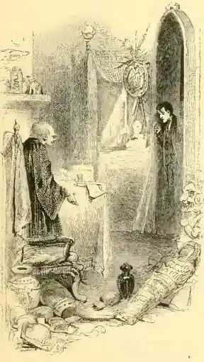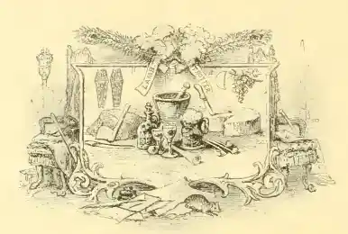 The brook was searched, but the body of the schoolmaster was not to be discovered. Hans Van Ripper, as executor of his estate, examined the bundle which contained all his worldly effects. They consisted of two shirts and a half, two stocks for the neck, a pair or two of worsted stockings, an old pair of corduroy small-clothes, a rusty razor, a book of psalm tunes full of dog’s ears, and a broken pitch-pipe. As to the books and furniture of the school-house, they belonged to the community, excepting Cotton Mather’s History of Witchcraft, a New England Almanac, and a book of dreams and fortune-telling; in which last was a sheet of foolscap much scribbled and blotted in several fruitless attempts to make a copy of verses in honor of the heiress of Van Tassel. These magic books and the poetic scrawl were forthwith consigned to the flames by Hans Van Ripper, who from that time forward determined to send his children no more to school, observing that he never knew any good come of this same reading and writing. Whatever money the schoolmaster possessed—and he had received his quarter’s pay but a day or two before—he must have had about his person at the time of his disappearance.