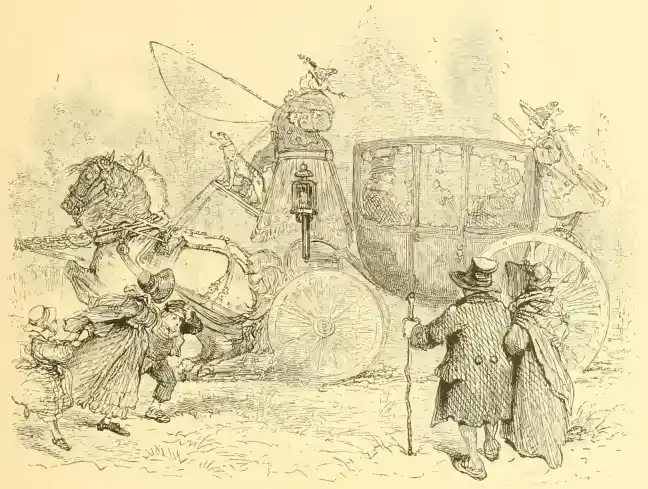 Ichabod was a suitable figure for such a steed. He rode with short stirrups, which brought his knees nearly up to the pommel of the saddle; his sharp elbows stuck out like grasshoppers’; he carried his whip perpendicularly in his hand like a sceptre; and as his horse jogged on the motion of his arms was not unlike the flapping of a pair of wings. A small wool hat rested on the top of his nose, for so his scanty strip of forehead might be called, and the skirts of his black coat fluttered out almost to his horse’s tail. Such was the appearance of Ichabod and his steed as they shambled out of the gate of Hans Van Ripper, and it was altogether such an apparition as is seldom to be met with in broad daylight.