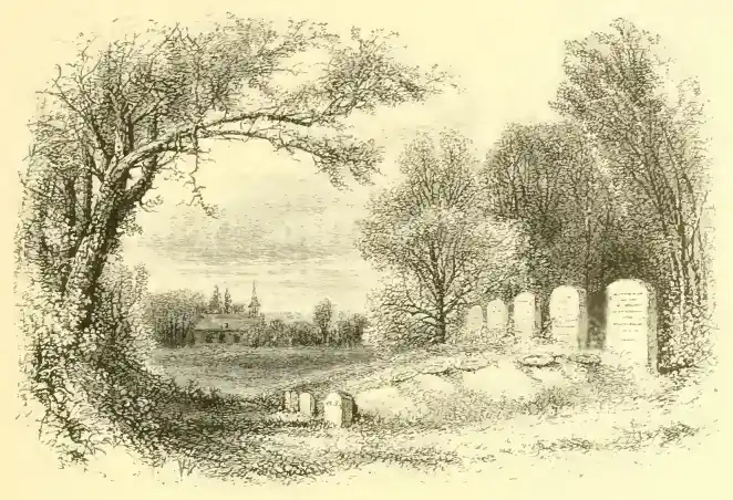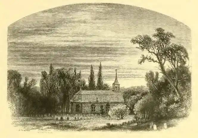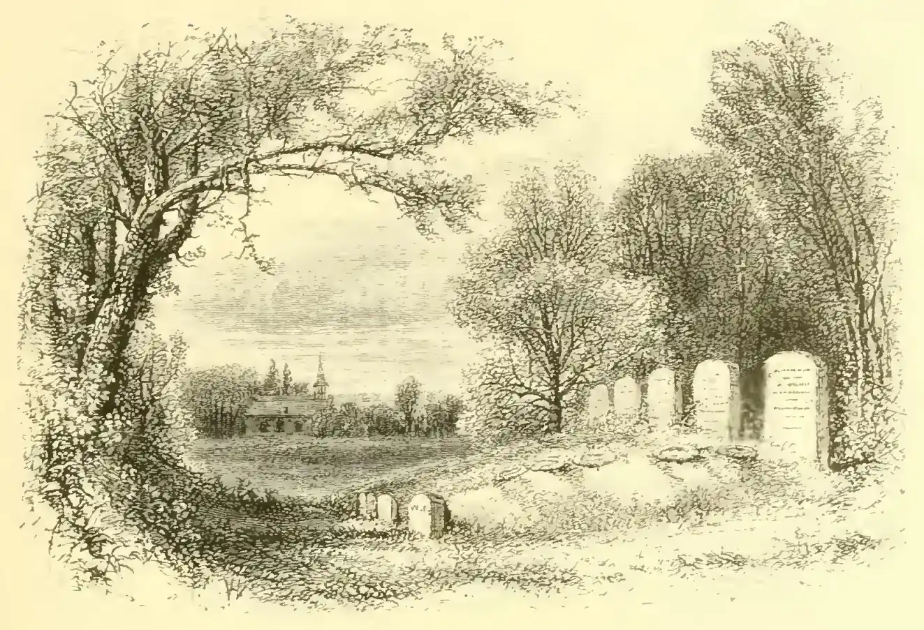 The sequestered situation of this church seems always to have made it a favorite haunt of troubled spirits. It stands on a knoll surrounded by locust trees and lofty elms, from among which its decent whitewashed walls shine modestly forth, like Christian purity beaming through the shades of retirement. A gentle slope descends from it to a silver sheet of water bordered by high trees, between which peeps may be caught at the blue hills of the Hudson. To look upon its grass-grown yard, where the sunbeams seem to sleep so quietly, one would think that there at least the dead might rest in peace. On one side of the church extends a wide woody dell, along which raves a large brook among broken rocks and trunks of fallen trees. Over a deep black part of the stream, not far from the church, was formerly thrown a wooden bridge; the road that led to it and the bridge itself were thickly shaded by overhanging trees, which cast a gloom about it even in the daytime, but occasioned a fearful darkness at night. Such was one of the favorite haunts of the headless horseman, and the place where he was most frequently encountered. The tale was told of old Brouwer, a most heretical disbeliever in ghosts, how he met the horseman returning from his foray into Sleepy Hollow, and was obliged to get up behind him; how they galloped over bush and brake, over hill and swamp, until they reached the bridge, when the horseman suddenly turned into a skeleton, threw old Brouwer into the brook, and sprang away over the tree-tops with a clap of thunder.