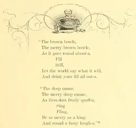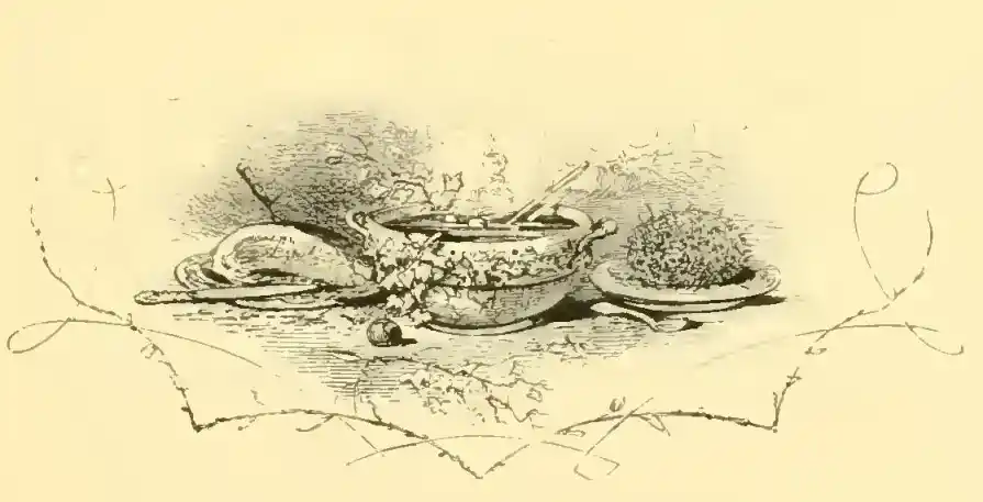 Fain would I pause to dwell upon the world of charms that burst upon the enraptured gaze of my hero as he entered the state parlor of Van Tassel’s mansion. Not those of the bevy of buxom lasses with their luxurious display of red and white, but the ample charms of a genuine Dutch country tea-table in the sumptuous time of autumn. Such heaped-up platters of cakes of various and almost indescribable kinds, known only to experienced Dutch housewives! There was the doughty doughnut, the tenderer oily koek, and the crisp and crumbling cruller; sweet cakes and short cakes, ginger cakes and honey cakes, and the whole family of cakes. And then there were apple pies and peach pies and pumpkin pies; besides slices of ham and smoked beef; and moreover delectable dishes of preserved plums and peaches and pears and quinces; not to mention broiled shad and roasted chickens; together with bowls of milk and cream,—all mingled higgledy-piggledy, pretty much as I have enumerated them, with the motherly teapot sending up its clouds of vapor from the midst. Heaven bless the mark! I want breath and time to discuss this banquet as it deserves, and am too eager to get on with my story. Happily, Ichabod Crane was not in so great a hurry as his historian, but did ample justice to every dainty.
