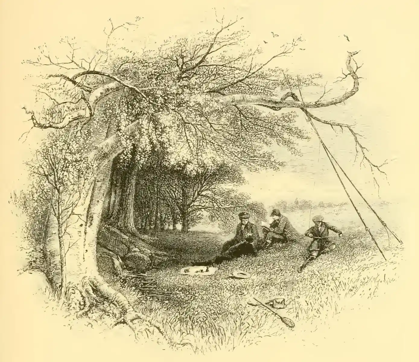 There is certainly something in angling—if we could forget, which anglers are apt to do, the cruelties and tortures inflicted on worms and insects—that tends to produce a gentleness of spirit and a pure serenity of mind. As the English are methodical even in their recreations, and are the most scientific of sportsmen, it has been reduced among them to perfect rule and system. Indeed, it is an amusement peculiarly adapted to the mild and highly-cultivated scenery of England, where every roughness has been softened away from the landscape. It is delightful to saunter along those limpid streams which wander, like veins of silver, through the bosom of this beautiful country, leading one through a diversity of small home scenery—sometimes winding through ornamented grounds; sometimes brimming along through rich pasturage, where the fresh green is mingled with sweet-smelling flowers; sometimes venturing in sight of villages and hamlets, and then running capriciously away into shady retirements. The sweetness and serenity of Nature and the quiet watchfulness of the sport gradually bring on pleasant fits of musing, which are now and then agreeably interrupted by the song of a bird, the distant whistle of the peasant, or perhaps the vagary of some fish leaping out of the still water and skimming transiently about its glassy surface. “When I would beget content,” says Izaak Walton, “and increase confidence in the power and wisdom and providence of Almighty God, I will walk the meadows by some gliding stream, and there contemplate the lilies that take no care, and those very many other little living creatures that are not only created, but fed (man knows not how) by the goodness of the God of Nature, and therefore trust in Him.”