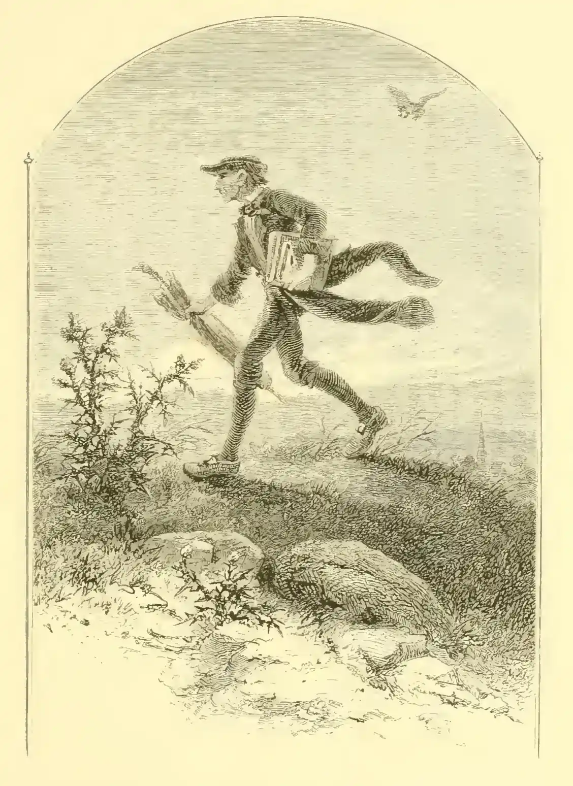 In this by-place of Nature there abode, in a remote period of American history—that is to say, some thirty years since—a worthy wight of the name of Ichabod Crane, who sojourned, or, as he expressed it, “tarried,” in Sleepy Hollow for the purpose of instructing the children of the vicinity. He was a native of Connecticut, a State which supplies the Union with pioneers for the mind as well as for the forest, and sends forth yearly its legions of frontier woodmen and country schoolmasters. The cognomen of Crane was not inapplicable to his person. He was tall, but exceedingly lank, with narrow shoulders, long arms and legs, hands that dangled a mile out of his sleeves, feet that might have served for shovels, and his whole frame most loosely hung together. His head was small, and flat at top, with huge ears, large green glassy eyes, and a long snip nose, so that it looked like a weathercock perched upon his spindle neck to tell which way the wind blew. To see him striding along the profile of a hill on a windy day, with his clothes bagging and fluttering about him, one might have mistaken him for the genius of Famine descending upon the earth, or some scarecrow eloped from a cornfield.