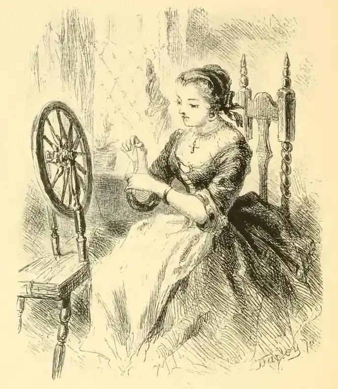 Among the musical disciples who assembled one evening in each week to receive his instructions in psalmody was Katrina Van Tassel, the daughter and only child of a substantial Dutch farmer. She was a blooming lass of fresh eighteen, plump as a partridge, ripe and melting and rosy-cheeked as one of her father’s peaches, and universally famed, not merely for her beauty, but her vast expectations. She was withal a little of a coquette, as might be perceived even in her dress, which was a mixture of ancient and modern fashions, as most suited to set off her charms. She wore the ornaments of pure yellow gold which her great-great-grandmother had brought over from Saardam, the tempting stomacher of the olden time, and withal a provokingly short petticoat to display the prettiest foot and ankle in the country round.