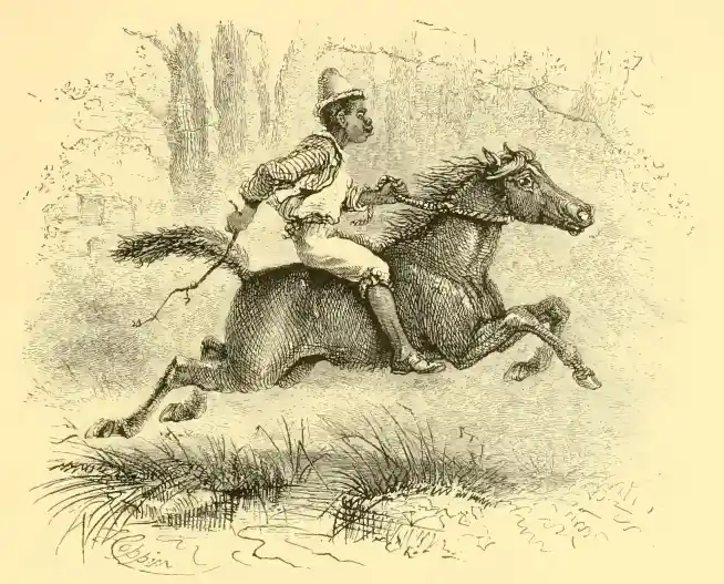 In this way, matters went on for some time without producing any material effect on the relative situation of the contending powers. On a fine autumnal afternoon Ichabod, in pensive mood, sat enthroned on the lofty stool whence he usually watched all the concerns of his little literary realm. In his hand he swayed a ferule, that sceptre of despotic power; the birch of justice reposed on three nails behind the throne, a constant terror to evildoers; while on the desk before him might be seen sundry contraband articles and prohibited weapons detected upon the persons of idle urchins, such as half-munched apples, popguns, whirligigs, fly-cages, and whole legions of rampant little paper gamecocks. Apparently there had been some appalling act of justice recently inflicted, for his scholars were all busily intent upon their books or slyly whispering behind them with one eye kept upon the master, and a kind of buzzing stillness reigned throughout the school-room. It was suddenly interrupted by the appearance of a negro in tow-cloth jacket and trowsers, a round-crowned fragment of a hat like the cap of Mercury, and mounted on the back of a ragged, wild, half-broken colt, which he managed with a rope by way of halter. He came clattering up to the school door with an invitation to Ichabod to attend a merry-making or “quilting frolic” to be held that evening at Mynheer Van Tassel’s; and, having delivered his message with that air of importance and effort at fine language which a negro is apt to display on petty embassies of the kind, he dashed over the brook, and was seen scampering away up the hollow, full of the importance and hurry of his mission.