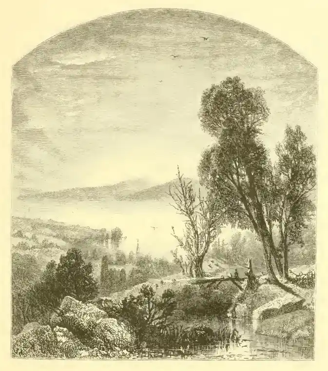 Thus feeding his mind with many sweet thoughts and “sugared suppositions,” he journeyed along the sides of a range of hills which look out upon some of the goodliest scenes of the mighty Hudson. The sun gradually wheeled his broad disk down into the west. The wide bosom of the Tappan Zee lay motionless and glassy, excepting that here and there a gentle undulation waved and prolonged the blue shadow of the distant mountain. A few amber clouds floated in the sky, without a breath of air to move them. The horizon was of a fine golden tint, changing gradually into a pure apple green, and from that into the deep blue of the mid-heaven. A slanting ray lingered on the woody crests of the precipices that overhung some parts of the river, giving greater depth to the dark-gray and purple of their rocky sides. A sloop was loitering in the distance, dropping slowly down with the tide, her sail hanging uselessly against the mast, and as the reflection of the sky gleamed along the still water it seemed as if the vessel was suspended in the air.