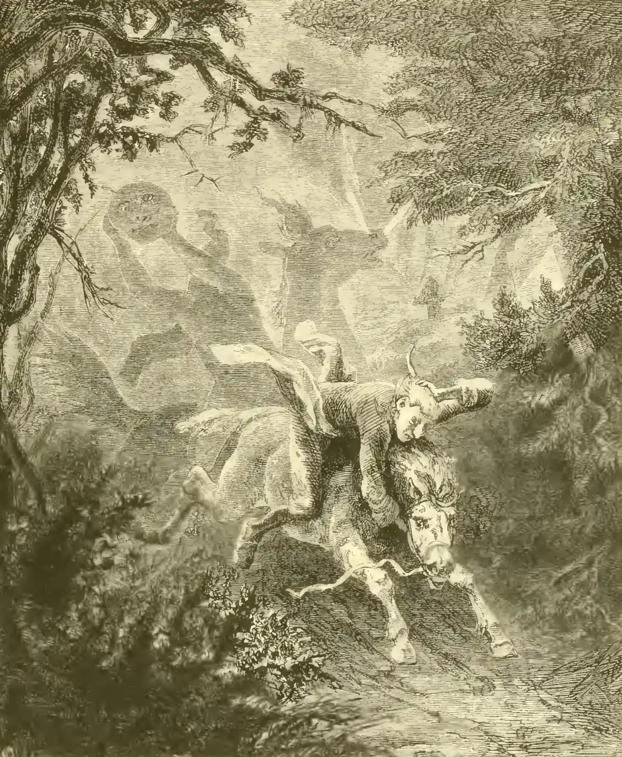 As yet the panic of the steed had given his unskillful rider an apparent advantage in the chase; but just as he had got halfway through the hollow the girths of the saddle gave away and he felt it slipping from under him. He seized it by the pommel and endeavored to hold it firm, but in vain, and had just time to save himself by clasping old Gunpowder round the neck, when the saddle fell to the earth, and he heard it trampled under foot by his pursuer. For a moment the terror of Hans Van Ripper’s wrath passed across his mind, for it was his Sunday saddle; but this was no time for petty fears; the goblin was hard on his haunches, and (unskilled rider that he was) he had much ado to maintain his seat, sometimes slipping on one side, sometimes on another, and sometimes jolted on the high ridge of his horse’s back-bone with a violence that he verily feared would cleave him asunder.