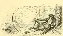 Ichabod, who had no relish for this strange midnight companion, and bethought himself of the adventure of Brom Bones with the Galloping Hessian, now quickened his steed in hopes of leaving him behind. The stranger, however, quickened his horse to an equal pace. Ichabod pulled up, and fell into a walk, thinking to lag behind; the other did the same. His heart began to sink within him; he endeavored to resume his psalm tune, but his parched tongue clove to the roof of his mouth and he could not utter a stave. There was something in the moody and dogged silence of this pertinacious companion that was mysterious and appalling. It was soon fearfully accounted for. On mounting a rising ground, which brought the figure of his fellow-traveller in relief against the sky, gigantic in height and muffled in a cloak, Ichabod was horror-struck on perceiving that he was headless! but his horror was still more increased on observing that the head, which should have rested on his shoulders, was carried before him on the pommel of the saddle. His terror rose to desperation, he rained a shower of kicks and blows upon Gunpowder, hoping by a sudden movement to give his companion the slip; but the spectre started full jump with him. Away, then, they dashed through thick and thin, stones flying and sparks flashing at every bound. Ichabod’s flimsy garments fluttered in the air as he stretched his long lank body away over his horse’s head in the eagerness of his flight.