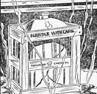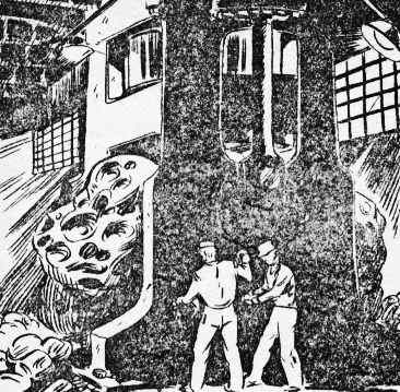 A huge truck transported the planet stone to the shops of the Swift Construction Company. One of the buildings had been cleared of all other work, and in it a very large furnace had been erected to cast the green disk. Powerful mechanisms crushed the meteorite to a fine powder which was dissolved by strong acids, then separated into its various ingredients.