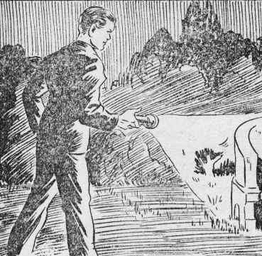 Slowly he moved the little handle over the graduated dial. A minute passed during which, so far as Ned could see, nothing happened. Without warning the green crystal suddenly glowed brightly for a fraction of a second, then could not be seen at all. The polished ring of metal in which it had been mounted alone remained.