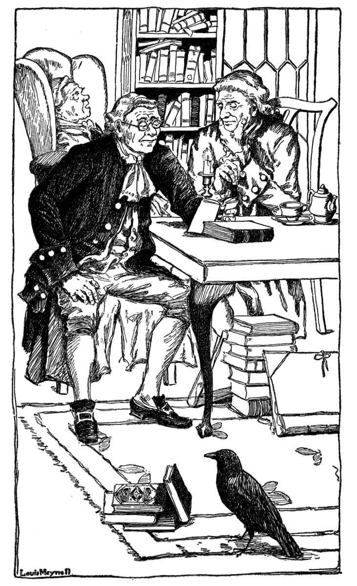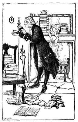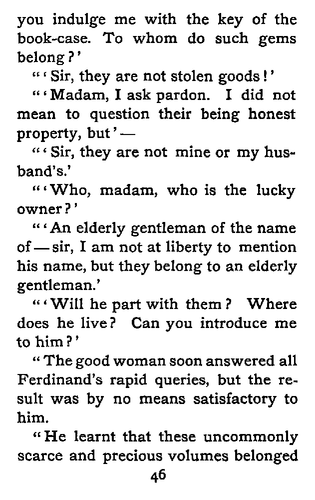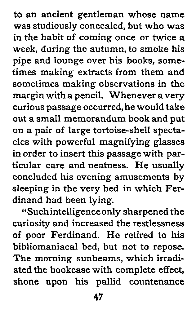 "He learnt that these uncommonly scarce and precious volumes belonged[47] to an ancient gentleman whose name was studiously concealed, but who was in the habit of coming once or twice a week, during the autumn, to smoke his pipe and lounge over his books, sometimes making extracts from them and sometimes making observations in the margin with a pencil. Whenever a very curious passage occurred, he would take out a small memorandum book and put on a pair of large tortoise-shell spectacles with powerful magnifying glasses in order to insert this passage with particular care and neatness. He usually concluded his evening amusements by sleeping in the very bed in which Ferdinand had been lying.