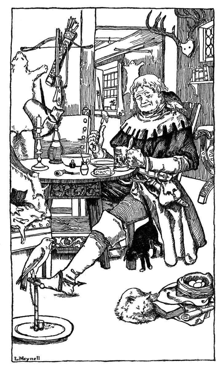 "He kept all sorts of hounds that ran buck, fox, hare, otter, and badger; and had hawks of all kinds, both long and short winged. His great hall was commonly strewed with marrow-bones, and full of hawk-perches, hounds, spaniels, and terriers. The upper end of it was hung with fox-skins of this and the last year's killing. Here and there a polecat was intermixed and hunter's poles[37] in great abundance. The parlour was a large room, completely furnished in the same style. On a broad hearth, paved with brick, lay some of the choicest terriers, hounds and spaniels. One or two of the great chairs had litters of cats in them, which were not to be disturbed. Of these, three or four always attended him at dinner, and a little white wand lay by his trencher, to defend it if they were too troublesome. In the windows, which were very large, lay his arrows, cross-bows, and other accoutrements. The corners of the room were filled with his best hunting and hawking poles. His oyster table stood at the lower end of the room, which was in constant use twice a day, all the year round; for he never failed to eat oysters both at dinner and supper, with which the neighbouring town of Pool supplied him.