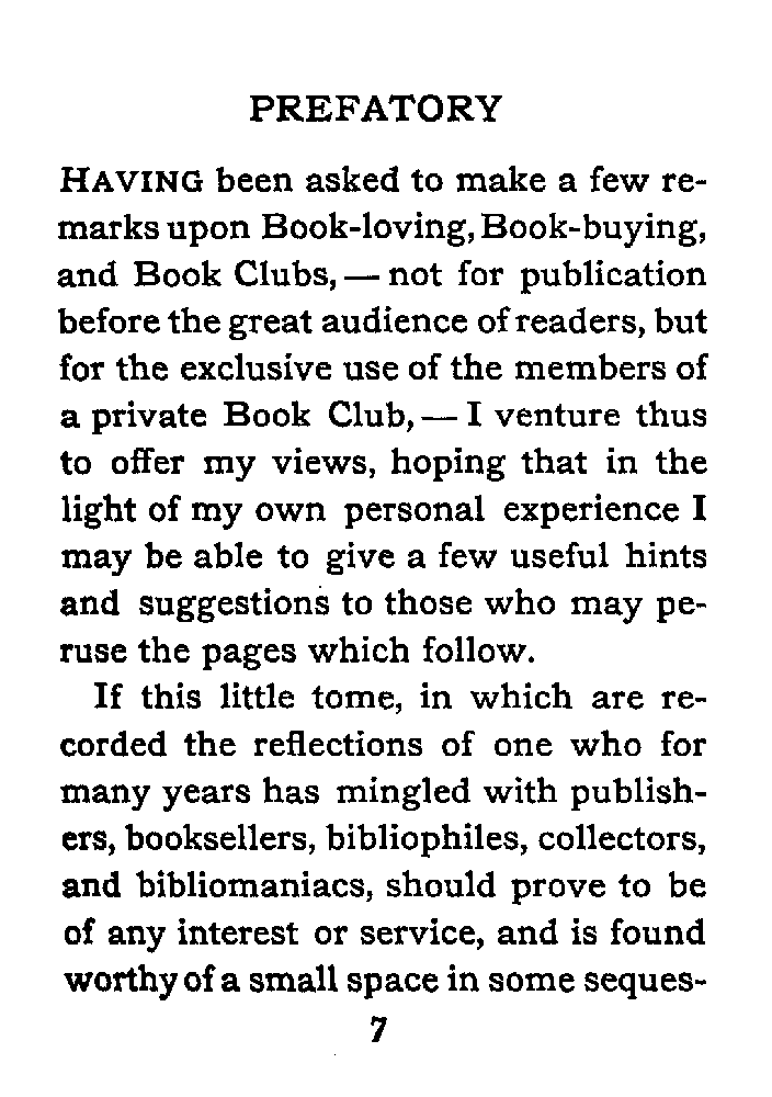 Having been asked to make a few remarks upon Book-loving, Book-buying, and Book Clubs,—not for publication before the great audience of readers, but for the exclusive use of the members of a private Book Club,—I venture thus to offer my views, hoping that in the light of my own personal experience I may be able to give a few useful hints and suggestions to those who may peruse the pages which follow.