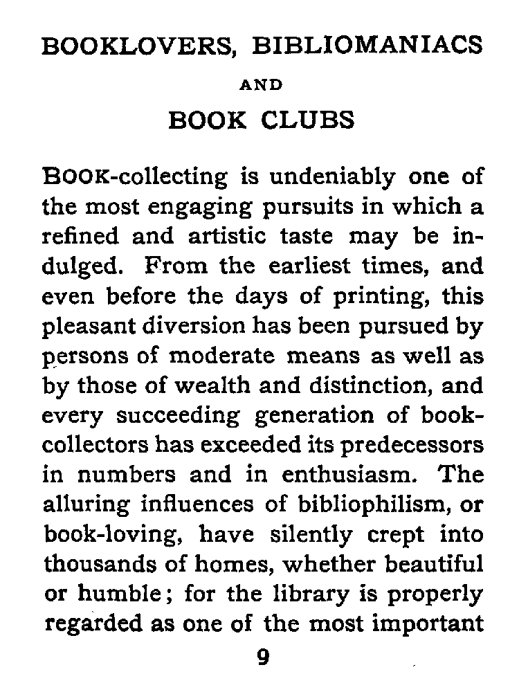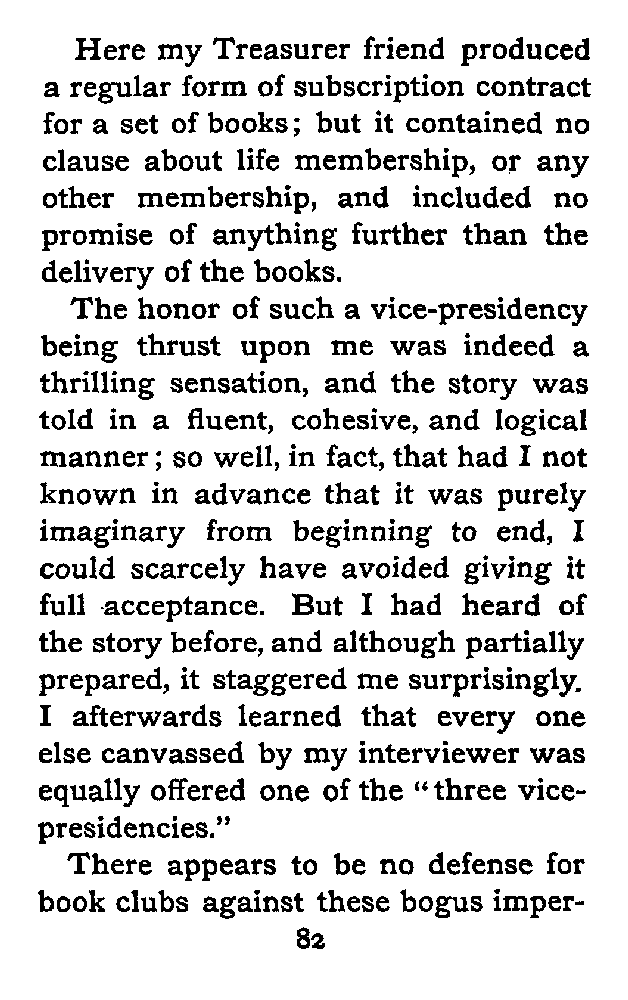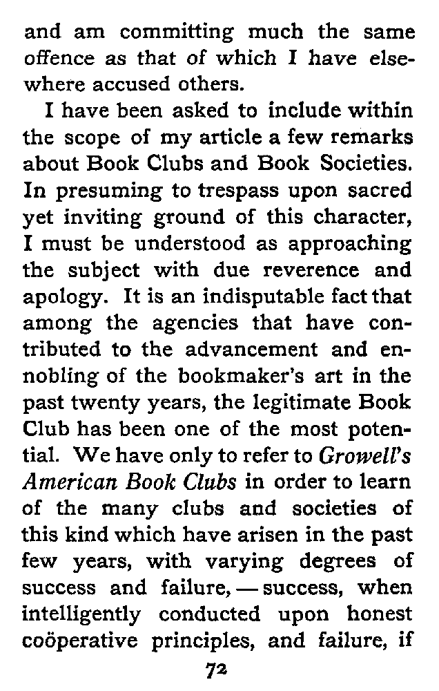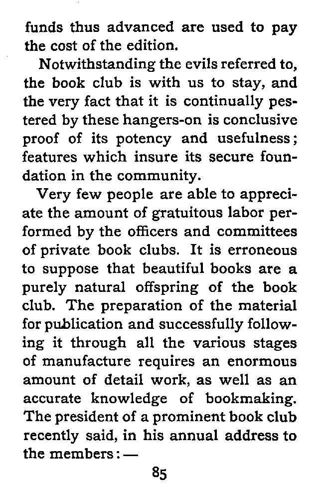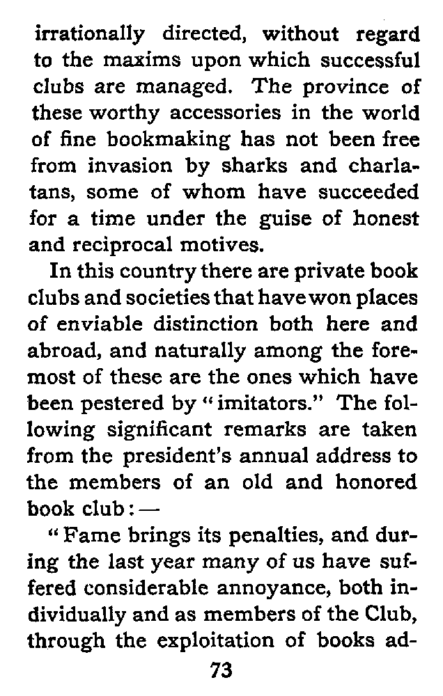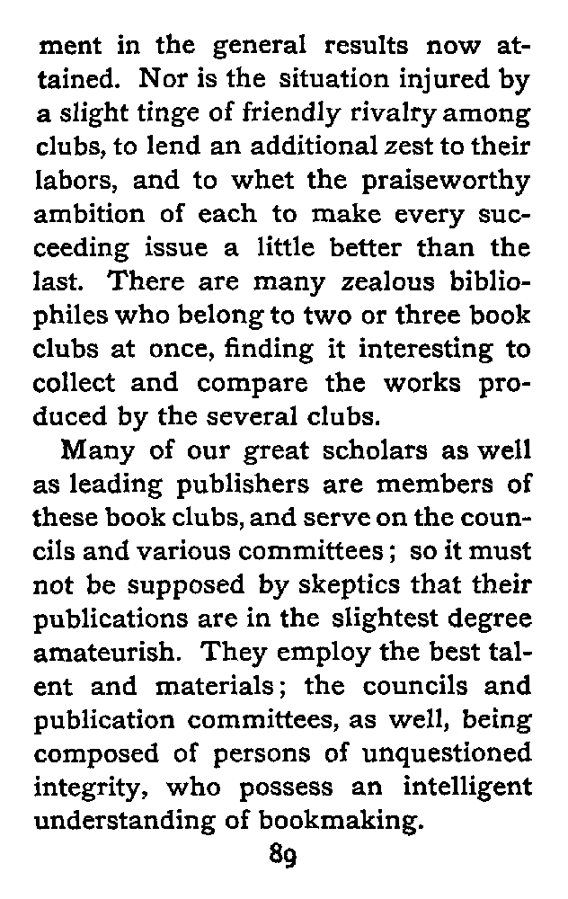 Many of our great scholars as well as leading publishers are members of these book clubs, and serve on the councils and various committees; so it must not be supposed by skeptics that their publications are in the slightest degree amateurish. They employ the best talent and materials; the councils and publication committees, as well, being composed of persons of unquestioned integrity, who possess an intelligent understanding of bookmaking.[90]