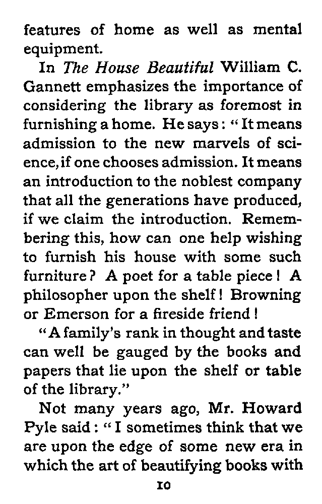In The House Beautiful William C. Gannett emphasizes the importance of considering the library as foremost in furnishing a home. He says: "It means admission to the new marvels of science, if one chooses admission. It means an introduction to the noblest company that all the generations have produced, if we claim the introduction. Remembering this, how can one help wishing to furnish his house with some such furniture? A poet for a table piece! A philosopher upon the shelf! Browning or Emerson for a fireside friend!