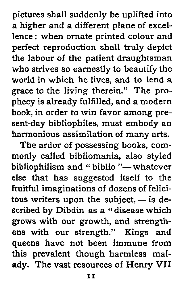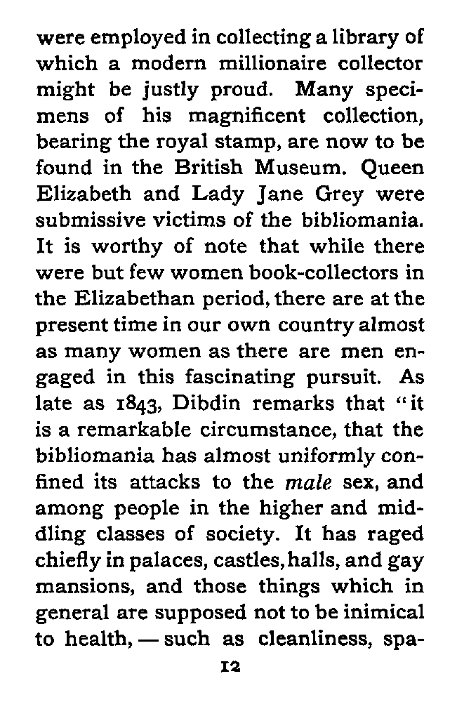 The ardor of possessing books, commonly called bibliomania, also styled bibliophilism and "biblio"—whatever else that has suggested itself to the fruitful imaginations of dozens of felicitous writers upon the subject,—is described by Dibdin as a "disease which grows with our growth, and strengthens with our strength." Kings and queens have not been immune from this prevalent though harmless malady. The vast resources of Henry VII[12] were employed in collecting a library of which a modern millionaire collector might be justly proud. Many specimens of his magnificent collection, bearing the royal stamp, are now to be found in the British Museum. Queen Elizabeth and Lady Jane Grey were submissive victims of the bibliomania. It is worthy of note that while there were but few women book-collectors in the Elizabethan period, there are at the present time in our own country almost as many women as there are men engaged in this fascinating pursuit. As late as 1843, Dibdin remarks that "it is a remarkable circumstance, that the bibliomania has almost uniformly confined its attacks to the male sex, and among people in the higher and middling classes of society. It has raged chiefly in palaces, castles, halls, and gay mansions, and those things which in general are supposed not to be inimical to health,—such as cleanliness, spaciousness,[13] and splendour, are only so many inducements to the introduction and propagation of the bibliomania!"