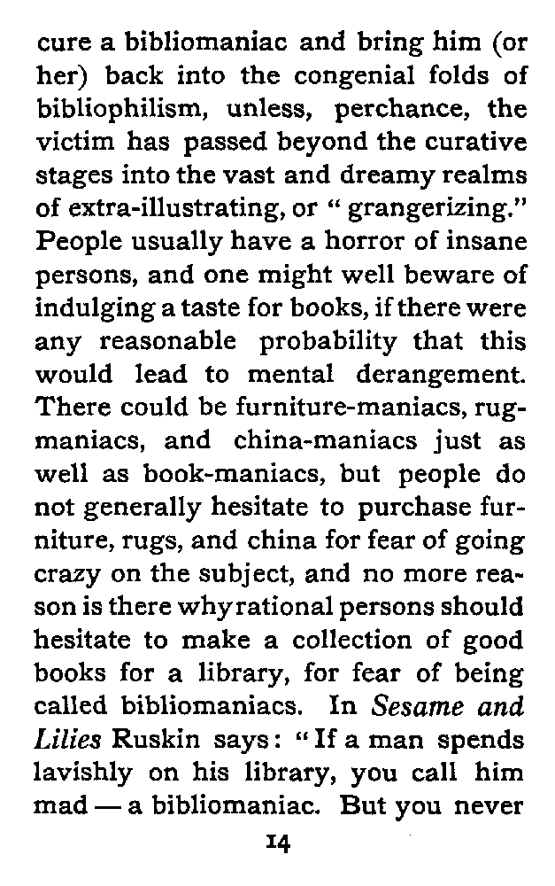 It should be remembered, however, that one possessing a fondness for books is not necessarily a bibliomaniac. There is as much difference between the inclinations and taste of a bibliophile and a bibliomaniac as between a slight cold and the advanced stages of consumption. Some one has said that "to call a bibliophile a bibliomaniac is to conduct a lover, languishing for his maiden's smile, to an asylum for the demented, and to shut him up in the ward for the incurables." Biblio relates to books, and mania is synonymous with madness, insanity, violent derangement, mental aberration, etc. A bibliomaniac, therefore, might properly be called an insane or crazy bibliophile. It is, however, a harmless insanity, and even in its worst stages it injures no one. Rational treatment may[14] cure a bibliomaniac and bring him (or her) back into the congenial folds of bibliophilism, unless, perchance, the victim has passed beyond the curative stages into the vast and dreamy realms of extra-illustrating, or "grangerizing." People usually have a horror of insane persons, and one might well beware of indulging a taste for books, if there were any reasonable probability that this would lead to mental derangement. There could be furniture-maniacs, rug-maniacs, and china-maniacs just as well as book-maniacs, but people do not generally hesitate to purchase furniture, rugs, and china for fear of going crazy on the subject, and no more reason is there why rational persons should hesitate to make a collection of good books for a library, for fear of being called bibliomaniacs. In Sesame and Lilies Ruskin says: "If a man spends lavishly on his library, you call him mad—a bibliomaniac. But you never[15] call one a horse-maniac, though men ruin themselves every day by their horses, and you do not hear of people ruining themselves by their books."