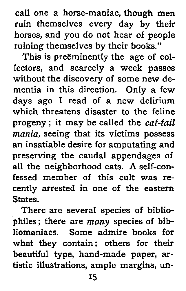 There are several species of bibliophiles; there are many species of bibliomaniacs. Some admire books for what they contain; others for their beautiful type, hand-made paper, artistic illustrations, ample margins, untrimmed[16] edges, etc.; and there are others who attach more importance to the limited number of copies issued than to either the contents or workmanship.