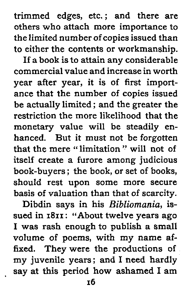 If a book is to attain any considerable commercial value and increase in worth year after year, it is of first importance that the number of copies issued be actually limited; and the greater the restriction the more likelihood that the monetary value will be steadily enhanced. But it must not be forgotten that the mere "limitation" will not of itself create a furore among judicious book-buyers; the book, or set of books, should rest upon some more secure basis of valuation than that of scarcity.