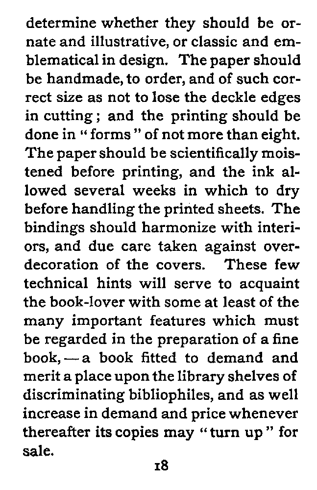 The contents, first to be considered, should be worthy of preservation; next in importance is the selection of appropriate type, and the size and style of page, which should be determined by the nature of the work and the period in which it was written. The size of the book and the margins of the page must be carefully considered in order to harmonize with the text-page. In choosing illustrations it is important to[18] determine whether they should be ornate and illustrative, or classic and emblematical in design. The paper should be handmade, to order, and of such correct size as not to lose the deckle edges in cutting; and the printing should be done in "forms" of not more than eight. The paper should be scientifically moistened before printing, and the ink allowed several weeks in which to dry before handling the printed sheets. The bindings should harmonize with interiors, and due care taken against over-decoration of the covers. These few technical hints will serve to acquaint the book-lover with some at least of the many important features which must be regarded in the preparation of a fine book,—a book fitted to demand and merit a place upon the library shelves of discriminating bibliophiles, and as well increase in demand and price whenever thereafter its copies may "turn up" for sale.