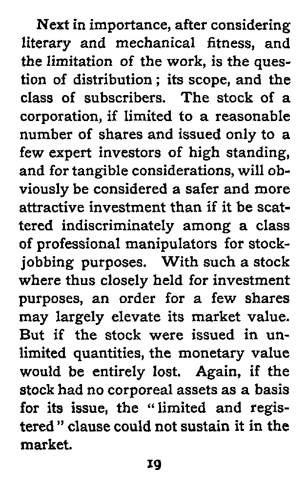 [19]Next in importance, after considering literary and mechanical fitness, and the limitation of the work, is the question of distribution; its scope, and the class of subscribers. The stock of a corporation, if limited to a reasonable number of shares and issued only to a few expert investors of high standing, and for tangible considerations, will obviously be considered a safer and more attractive investment than if it be scattered indiscriminately among a class of professional manipulators for stock-jobbing purposes. With such a stock where thus closely held for investment purposes, an order for a few shares may largely elevate its market value. But if the stock were issued in unlimited quantities, the monetary value would be entirely lost. Again, if the stock had no corporeal assets as a basis for its issue, the "limited and registered" clause could not sustain it in the market.[20]