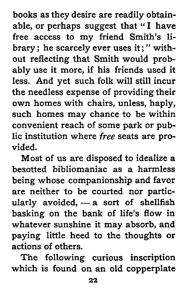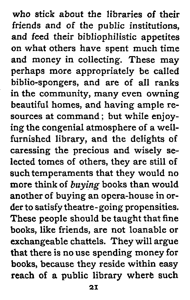 Passing now to those who, in one way or another, are to meet with and handle the completed book, we may begin with a class of literary barnacles[21] who stick about the libraries of their friends and of the public institutions, and feed their bibliophilistic appetites on what others have spent much time and money in collecting. These may perhaps more appropriately be called biblio-spongers, and are of all ranks in the community, many even owning beautiful homes, and having ample resources at command; but while enjoying the congenial atmosphere of a well-furnished library, and the delights of caressing the precious and wisely selected tomes of others, they are still of such temperaments that they would no more think of buying books than would another of buying an opera-house in order to satisfy theatre-going propensities. These people should be taught that fine books, like friends, are not loanable or exchangeable chattels. They will argue that there is no use spending money for books, because they reside within easy reach of a public library where such[22] books as they desire are readily obtainable, or perhaps suggest that "I have free access to my friend Smith's library; he scarcely ever uses it;" without reflecting that Smith would probably use it more, if his friends used it less. And yet such folk will still incur the needless expense of providing their own homes with chairs, unless, haply, such homes may chance to be within convenient reach of some park or public institution where free seats are provided.