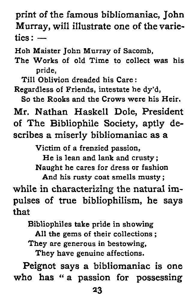 Mr. Nathan Haskell Dole, President of The Bibliophile Society, aptly describes a miserly bibliomaniac as a