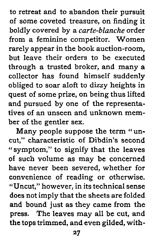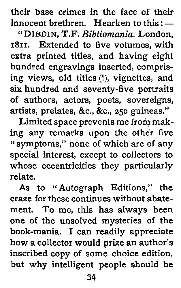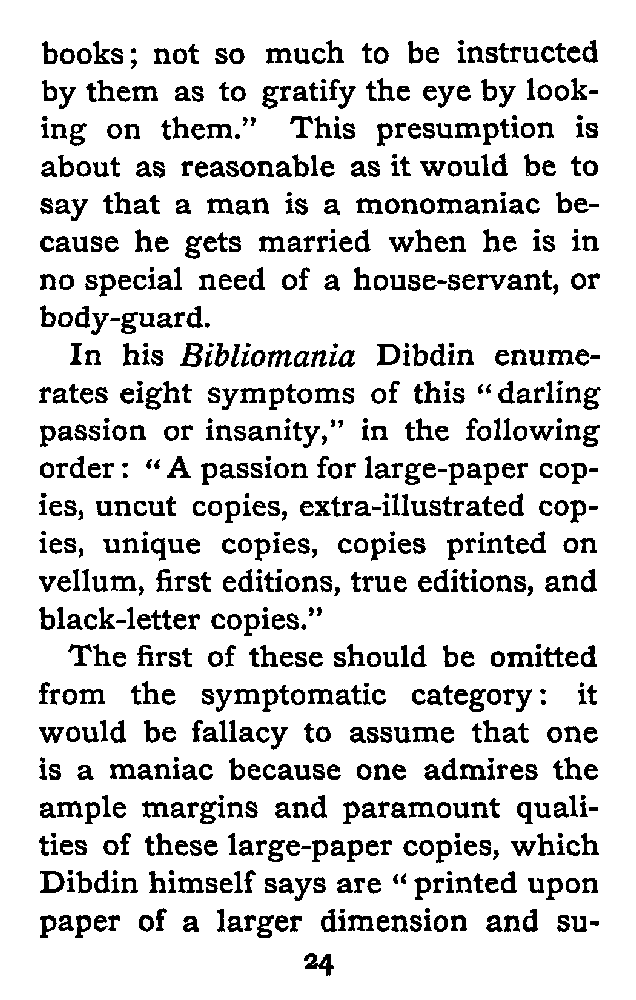 In his Bibliomania Dibdin enumerates eight symptoms of this "darling passion or insanity," in the following order: "A passion for large-paper copies, uncut copies, extra-illustrated copies, unique copies, copies printed on vellum, first editions, true editions, and black-letter copies."