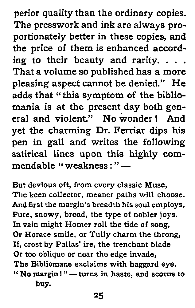 The first of these should be omitted from the symptomatic category: it would be fallacy to assume that one is a maniac because one admires the ample margins and paramount qualities of these large-paper copies, which Dibdin himself says are "printed upon paper of a larger dimension and superior[25] quality than the ordinary copies. The presswork and ink are always proportionately better in these copies, and the price of them is enhanced according to their beauty and rarity. . . . That a volume so published has a more pleasing aspect cannot be denied." He adds that "this symptom of the bibliomania is at the present day both general and violent." No wonder! And yet the charming Dr. Ferriar dips his pen in gall and writes the following satirical lines upon this highly commendable "weakness:"—