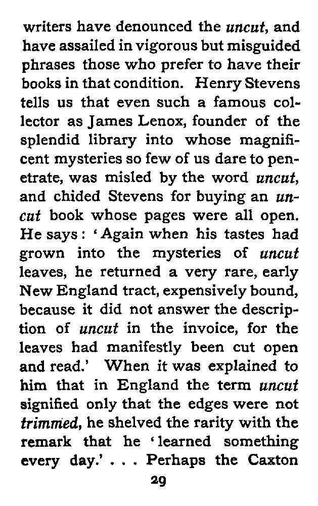 Many people suppose the term "uncut," characteristic of Dibdin's second "symptom," to signify that the leaves of such volume as may be concerned have never been severed, whether for convenience of reading or otherwise. "Uncut," however, in its technical sense does not imply that the sheets are folded and bound just as they came from the press. The leaves may all be cut, and the tops trimmed, and even gilded, without[28] striking terror to the heart of the bibliomaniac. Dibdin, indeed, treats this last mentioned symptom in merely a superficial way and dismisses it with a few cursory remarks, viz: "It may be defined a passion to possess books of which the edges have never been sheared by the binder's tools." This definition is vague and unsatisfactory. Mr. Adrian H. Joline (Diversions of a Booklover, Harper & Bros., New York, 1903,—a charming book that should be read by every book-fancier) discourses upon the subject more intelligently; he observes that the word uncut appears to be a stumbling-block to the unwary, and says: "The casual purchaser is sometimes deceived by it, for he thinks that it means that the leaves have not been severed by the paper-knife. I have read with much glee divers indignant letters in the very interesting 'Saturday Review' of one of our best New York journals, in which the barbarian[29] writers have denounced the uncut, and have assailed in vigorous but misguided phrases those who prefer to have their books in that condition. Henry Stevens tells us that even such a famous collector as James Lenox, founder of the splendid library into whose magnificent mysteries so few of us dare to penetrate, was misled by the word uncut, and chided Stevens for buying an uncut book whose pages were all open. He says: 'Again when his tastes had grown into the mysteries of uncut leaves, he returned a very rare, early New England tract, expensively bound, because it did not answer the description of uncut in the invoice, for the leaves had manifestly been cut open and read.' When it was explained to him that in England the term uncut signified only that the edges were not trimmed, he shelved the rarity with the remark that he 'learned something every day.' . . . Perhaps the Caxton[30] Club of Chicago is wise in describing its productions as 'with edges untrimmed.' Even a Philistine ought to be able to comprehend that description, although I once knew a man who supposed that a book 'bound in boards' had sides composed of planking."