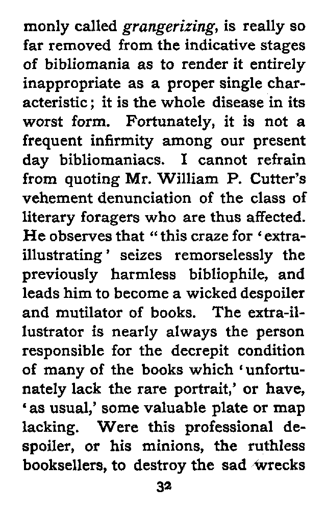 The third "symptom" defined by Dibdin, viz: "extra-illustrating," commonly[32] called grangerizing, is really so far removed from the indicative stages of bibliomania as to render it entirely inappropriate as a proper single characteristic; it is the whole disease in its worst form. Fortunately, it is not a frequent infirmity among our present day bibliomaniacs. I cannot refrain from quoting Mr. William P. Cutter's vehement denunciation of the class of literary foragers who are thus affected. He observes that "this craze for 'extra-illustrating' seizes remorselessly the previously harmless bibliophile, and leads him to become a wicked despoiler and mutilator of books. The extra-illustrator is nearly always the person responsible for the decrepit condition of many of the books which 'unfortunately lack the rare portrait,' or have, 'as usual,' some valuable plate or map lacking. Were this professional despoiler, or his minions, the ruthless booksellers, to destroy the sad wrecks[33] which result from their piratical depredations, all would be well. But they set these poor maimed hulks adrift again, to seek salvage from some deluded collector, or some impoverished or ignorant librarian.