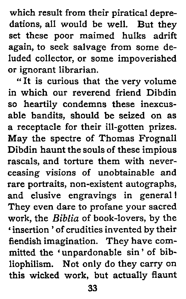 "It is curious that the very volume in which our reverend friend Dibdin so heartily condemns these inexcusable bandits, should be seized on as a receptacle for their ill-gotten prizes. May the spectre of Thomas Frognall Dibdin haunt the souls of these impious rascals, and torture them with never-ceasing visions of unobtainable and rare portraits, non-existent autographs, and elusive engravings in general! They even dare to profane your sacred work, the Biblia of book-lovers, by the 'insertion' of crudities invented by their fiendish imagination. They have committed the 'unpardonable sin' of bibliophilism. Not only do they carry on this wicked work, but actually flaunt[34] their base crimes in the face of their innocent brethren. Hearken to this:—