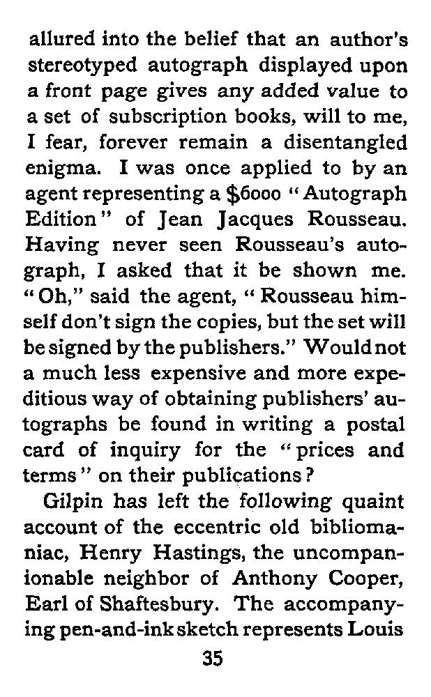 As to "Autograph Editions," the craze for these continues without abatement. To me, this has always been one of the unsolved mysteries of the book-mania. I can readily appreciate how a collector would prize an author's inscribed copy of some choice edition, but why intelligent people should be[35] allured into the belief that an author's stereotyped autograph displayed upon a front page gives any added value to a set of subscription books, will to me, I fear, forever remain a disentangled enigma. I was once applied to by an agent representing a $6000 "Autograph Edition" of Jean Jacques Rousseau. Having never seen Rousseau's autograph, I asked that it be shown me. "Oh," said the agent, "Rousseau himself don't sign the copies, but the set will be signed by the publishers." Would not a much less expensive and more expeditious way of obtaining publishers' autographs be found in writing a postal card of inquiry for the "prices and terms" on their publications?