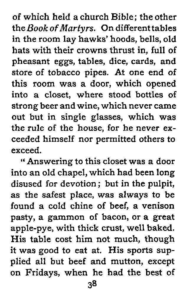 "Answering to this closet was a door into an old chapel, which had been long disused for devotion; but in the pulpit, as the safest place, was always to be found a cold chine of beef, a venison pasty, a gammon of bacon, or a great apple-pye, with thick crust, well baked. His table cost him not much, though it was good to eat at. His sports supplied all but beef and mutton, except on Fridays, when he had the best of[39] fish. He never wanted a London pudding, and he always sang it in with 'My part lies therein-a.' He drank a glass or two of wine at meals; put syrup of gilly-flowers into his sack, and had always a tun glass of small beer standing by him, which he often stirred about with rosemary. He lived to be an hundred, and never lost his eyesight, nor used spectacles. He got on horseback without help, and rode to the death of the stag till he was past four-score."