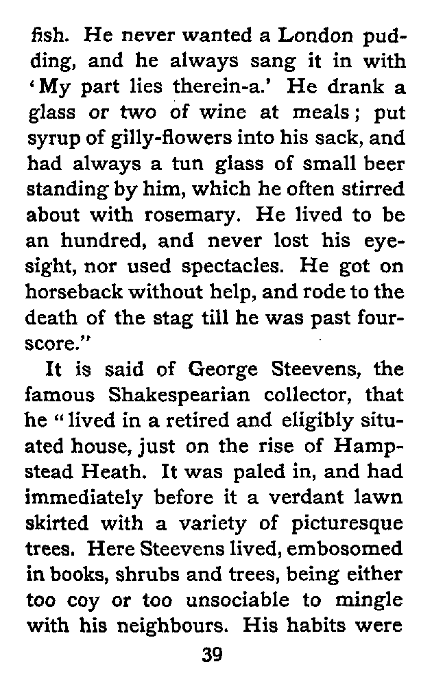 It is said of George Steevens, the famous Shakespearian collector, that he "lived in a retired and eligibly situated house, just on the rise of Hampstead Heath. It was paled in, and had immediately before it a verdant lawn skirted with a variety of picturesque trees. Here Steevens lived, embosomed in books, shrubs and trees, being either too coy or too unsociable to mingle with his neighbours. His habits were[40] indeed peculiar: not much to be envied or imitated, as they sometimes betrayed the flights of a madman and sometimes the asperities of a cynic. His attachments were warm but fickle both in choice and duration. He would frequently part from one with whom he had lived on terms of close intimacy, without any assignable cause, and his enmities once fixed were immovable. There was indeed a kind of venom in his antipathies, nor would he suffer his ears to be assailed or his heart to relent in favour of those against whom he entertained animosities, however capricious and unfounded. In one pursuit only was he consistent: one object only did he woo with an inflexible attachment; and that object was Dame Drama."