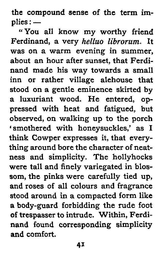 "You all know my worthy friend Ferdinand, a very helluo librorum. It was on a warm evening in summer, about an hour after sunset, that Ferdinand made his way towards a small inn or rather village alehouse that stood on a gentle eminence skirted by a luxuriant wood. He entered, oppressed with heat and fatigued, but observed, on walking up to the porch 'smothered with honeysuckles,' as I think Cowper expresses it, that everything around bore the character of neatness and simplicity. The hollyhocks were tall and finely variegated in blossom, the pinks were carefully tied up, and roses of all colours and fragrance stood around in a compacted form like a body-guard forbidding the rude foot of trespasser to intrude. Within, Ferdinand found corresponding simplicity and comfort.[42]