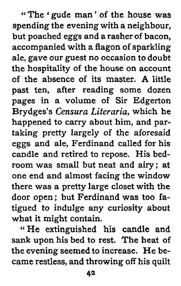 "The 'gude man' of the house was spending the evening with a neighbour, but poached eggs and a rasher of bacon, accompanied with a flagon of sparkling ale, gave our guest no occasion to doubt the hospitality of the house on account of the absence of its master. A little past ten, after reading some dozen pages in a volume of Sir Edgerton Brydges's Censura Literaria, which he happened to carry about him, and partaking pretty largely of the aforesaid eggs and ale, Ferdinand called for his candle and retired to repose. His bedroom was small but neat and airy; at one end and almost facing the window there was a pretty large closet with the door open; but Ferdinand was too fatigued to indulge any curiosity about what it might contain.