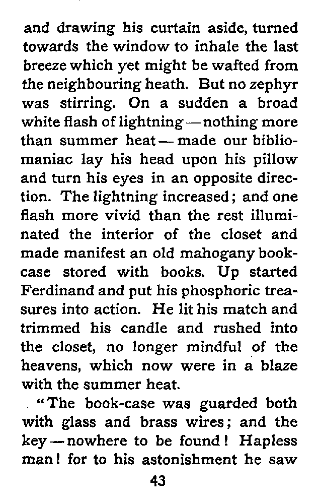 "He extinguished his candle and sank upon his bed to rest. The heat of the evening seemed to increase. He became restless, and throwing off his quilt[43] and drawing his curtain aside, turned towards the window to inhale the last breeze which yet might be wafted from the neighbouring heath. But no zephyr was stirring. On a sudden a broad white flash of lightning—nothing more than summer heat—made our bibliomaniac lay his head upon his pillow and turn his eyes in an opposite direction. The lightning increased; and one flash more vivid than the rest illuminated the interior of the closet and made manifest an old mahogany book-case stored with books. Up started Ferdinand and put his phosphoric treasures into action. He lit his match and trimmed his candle and rushed into the closet, no longer mindful of the heavens, which now were in a blaze with the summer heat.