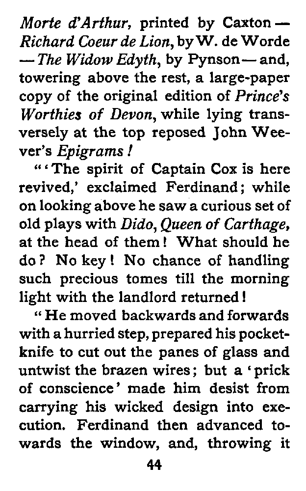 "The book-case was guarded both with glass and brass wires; and the key—nowhere to be found! Hapless man! for to his astonishment he saw[44] Morte d'Arthur, printed by Caxton—Richard Coeur de Lion, by W. de Worde—The Widow Edyth, by Pynson—and, towering above the rest, a large-paper copy of the original edition of Prince's Worthies of Devon, while lying transversely at the top reposed John Weever's Epigrams!