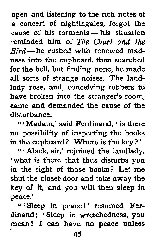 "'Sleep in peace!' resumed Ferdinand; 'Sleep in wretchedness, you mean! I can have no peace unless[46] you indulge me with the key of the book-case. To whom do such gems belong?'